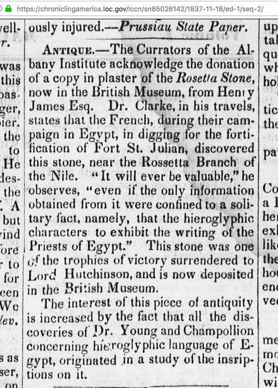 In a notice entitled "Antique," [shown above] we read that "The Currators [sic] of the Albany Institute [Albany, New York] acknowledge the donation of a copy in plaster of the Rosetta Stone, now in the British Museum, from Henry James Esq."