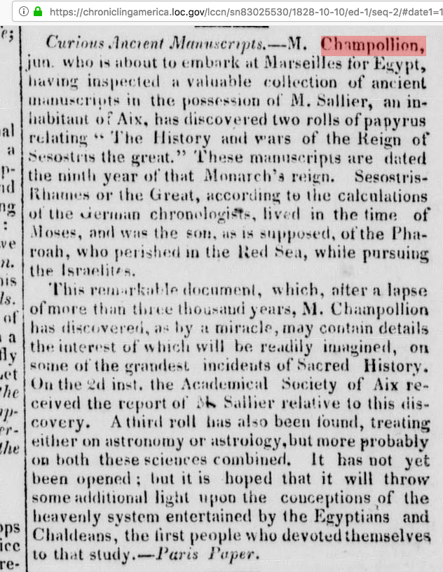 Was Champollion an unknown in Joseph's day? If so, one clue might be found in books and newspapers that mention Champollion. Do they need to take several sentences to explain to all the non-scholars and non-French speakers just who he is and what the Rosetta Stone was in order to bring readers up to speed, or do they act as if everyone knows the man and what he did? Below is an 1828 newspaper from Delaware, not far from where the Saints were. The source is the Delaware Journal, October 10, 1828, page 2, available at the Library of Congress' Chronicling America site (https://chroniclingamerica.loc.gov):