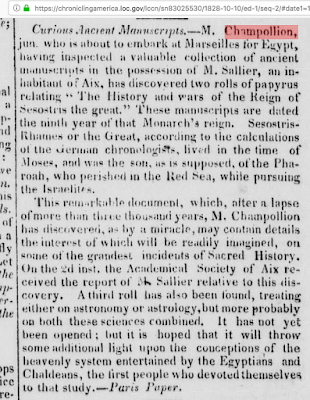That's an astonishing assertion. Americans in the 1830s had not heard of Champollion's work? Only a tiny group of scholars were in on the news? And should we also believe that news of the Rosetta Stone and its related implications had also gone unnoticed in the U.S.? Sure, the detailed scholarly work of Champollion was for scholars, but the headlines were for everyone. Was there Egyptomania or not?Even after Champollion's groundbreaking discoveries, though, some continued to assert competing theories about Egyptian hieroglyphs, whether they rejected Champollion's findings or were ignorant of them. Indeed, in America in the 1830s and 1840s, Champollion's findings were available to only a small group of scholars who either read them in French or gleaned them from a limited number of English translations or summaries. (Volume 4, p. xviii)