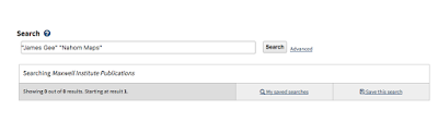 Actually, every search I've tried at the new site has disappointed me. If pinpoint precision for authors and titles cannot bring up the targeted article near the top of a list of results, the manual creation of new links will be more tedious than ever before. My latest target was an article by James Gee, "The Nahom Maps," that was published in the Journal of the Book of Mormon and Restoration Scripture 17/1–2 (2008): 40–57. I began with a search in the Maxwell Institute area for James Gee. There were 14 hits, none of which had any "Gee" as an author or "Gee" in the title. In fact, the word "James" didn't even show up in the names or titles. This is a very unique search engine!