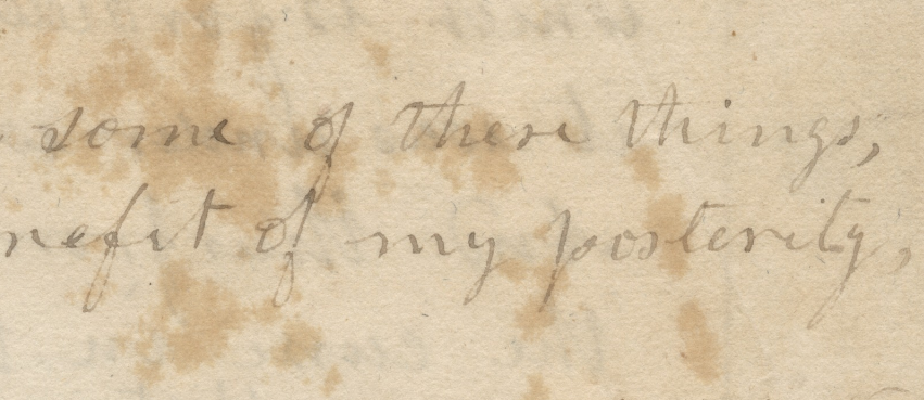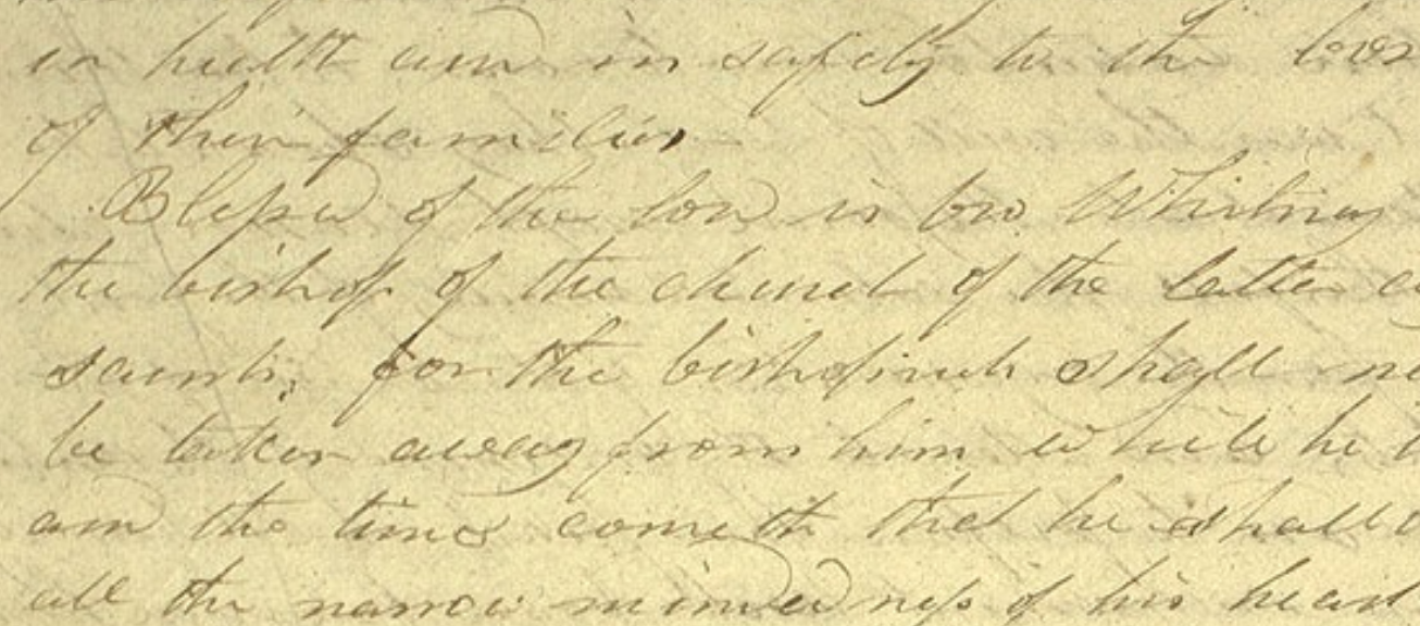 ...plainness of sentiment with which I wish toWhen he crossed out the erroneous words and continued writing, the ink or the ink flow seems to change, resulting in somewhat darker text. There may have been a break or pause before this point, or simply a refreshing of his ink source, though it's hard to know. In any case, it illustrates that his writing can vary within a single document and how easy it is to make mistakes when visually copying a document.unbosom my feelingswrite. For know assuredly sir to you I wish to unbosom my feelings, and unravil the secrets of my heart: as before the omnicient Judge of all the earth.