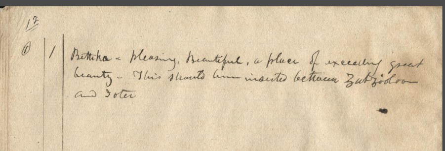 - Page 17, which has "Bethka" at the top of the page with a note that it should have been inserted between "Iota" and "Zub Zoal oan" on the previous page, page 16. The page is then filled with additional words and definitions.