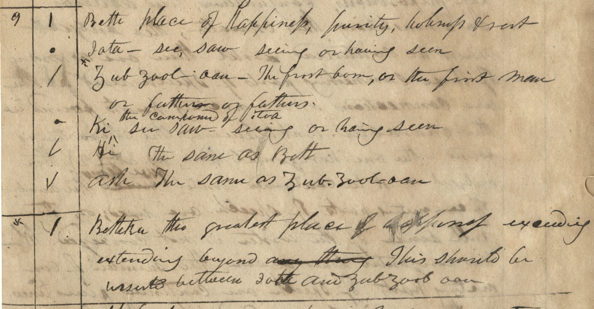 In creating a dictionary or an "alphabet" of a foreign language, what is the importance of word order? If one is creating a versatile tool for translating texts, the order should enable one to easily look up a word to find its meaning. In Chinese-English dictionaries, for example, Chinese words can be arranged based upon alphabetic order of the transliteration, or based on characteristics of the characters (governing portions called "radicals" or number of strokes) that can make it easy ("easy" compared to having no order -- it still can be difficult) to find a word. Lists of words for language study can be grouped in other ways as well (common verbs, common nouns, etc.). But what is it about "Bethka" that requires it to be inserted not next to "Beth" but between "Iota" and "Zub Zoal oan"? Why would Phelps care about precise word order here when the words aren't being arranged alphabetically or based on common meaning, sound, or structure of the "Egyptian" character (