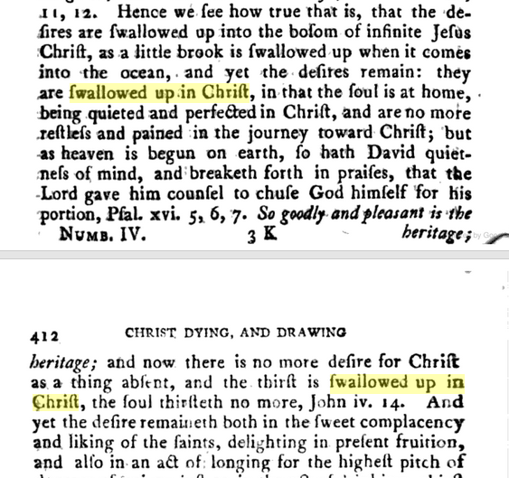 "Swallowed up in Christ" is not unique to the Book of Mormon. The Scottish pastor Samuel Rutherford's writings have it in 1803 on pp. 411-412 of his 739-page tome, Christ Dying and Drawing Sinners to Himself (Glasgow: Samuel and Archibald Gardner, 1803), though his context may have little to do with Isaiah 25:8, but speaks of how our earthly desires can be swallowed up in Christ as we follow him: