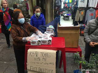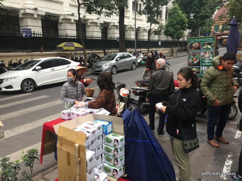 Early this Saturday morning as we went on a walk to a nearby lake in the Old Quarter of Hanoi, I saw a small group of people on the sidewalk, the place where vendors of all kinds, especially little restaurants, set up shop, making sidewalks almost impossible to walk on sometimes. It looked like an opportunistic mom-and-pop operation with a big cardboard box of face masks, a cheap plastic table, and a makeshift sign.