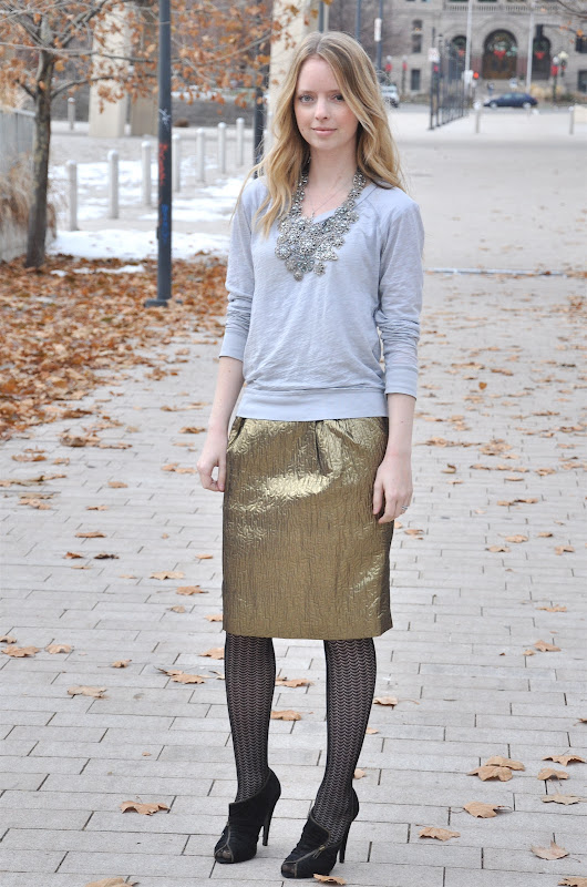 Gold was all over the runways for Fall/Winter 2010-11. Since this gold skirt is such a statement maker, we decided to mix it up (and tone it down a bit) with a sweatshirt style top. To keep the mix balanced we paired the sweatshirt top with a seriously jeweled necklace, then toughened the whole thing up with some lacy patterned tights and zippered booties. The Modest Girl can party in style. We love Banana Republic for statement making jewelry.