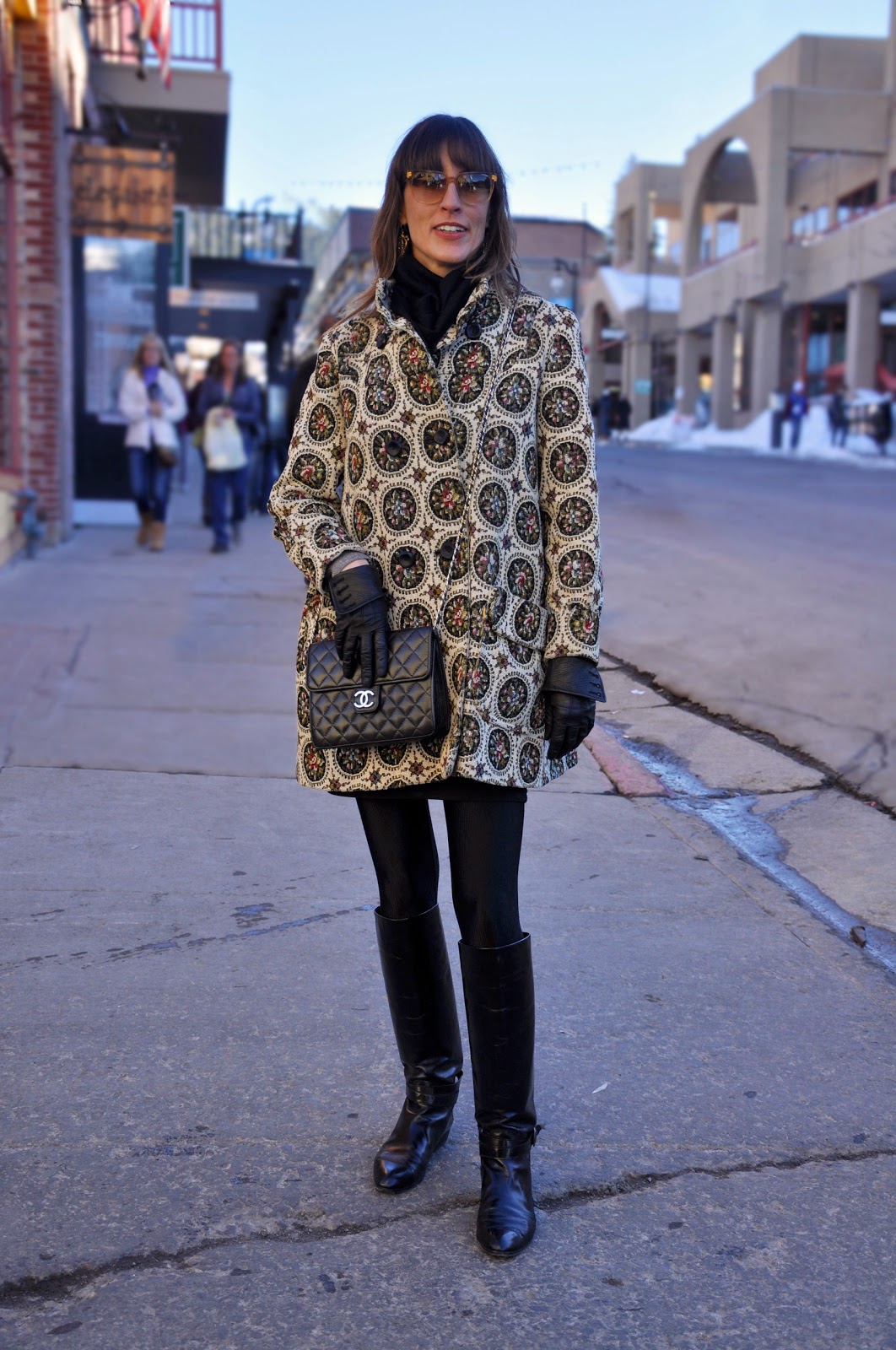 Sometimes it's tough to stand out from the crowd when it comes to winter outerwear. I love some nice black now and again but by the time the end of January rolls around my eyes are thirsting for something to pique my interest. It was a pretty quiet afternoon on Park City's Main Street, when we Good Girls at Thread Ethic stopped for a cafe snack. Soon after we ordered, in walks this lovely girl and her lovely coat, chic gloves and pretty Chanel handbag (worn cross-body). Gorgeous. What a delightful way to rejuvenate our winter afternoon and provide us with some true Sundance festival fashion.