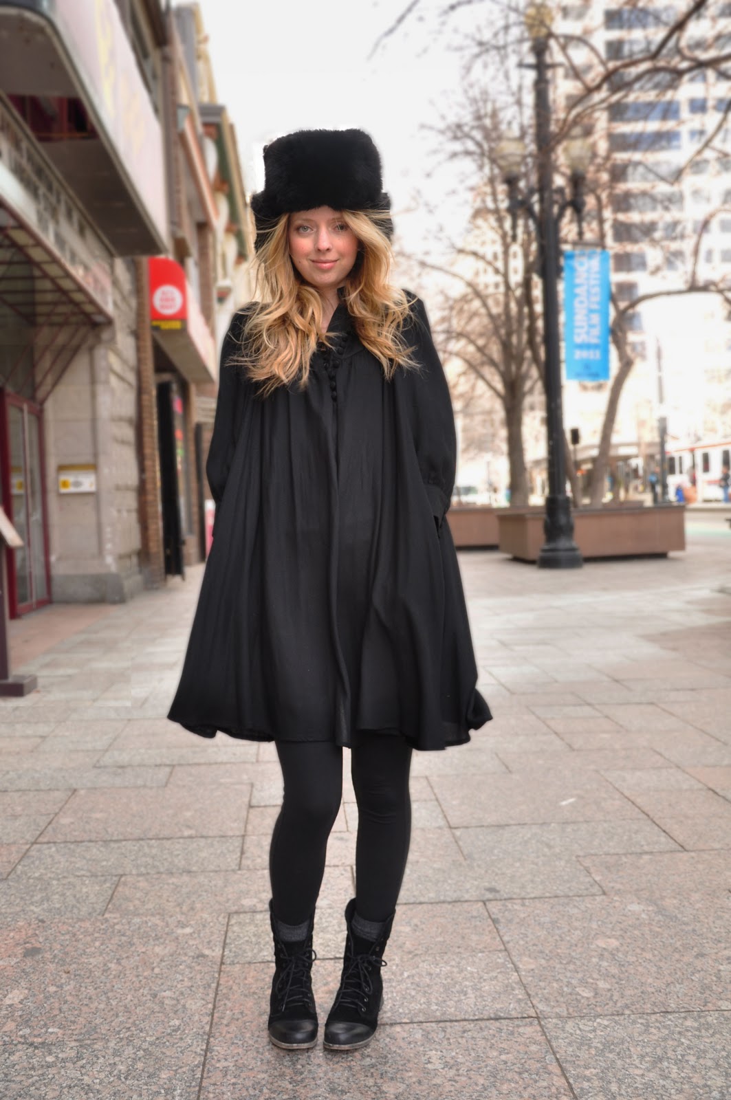 I love indulging in all black once in a while. My husband teases me sometimes and says I look like I'm going to a funeral, or am trying to be dramatic, but really sometimes it just feels so perfectly pulled together to wear all black. Here I've brought out said husband's fabulous Russian fur hat (that he actually brought back from Russia) and paired it with an H&M dress, Express leggings, and Forever 21 boots.