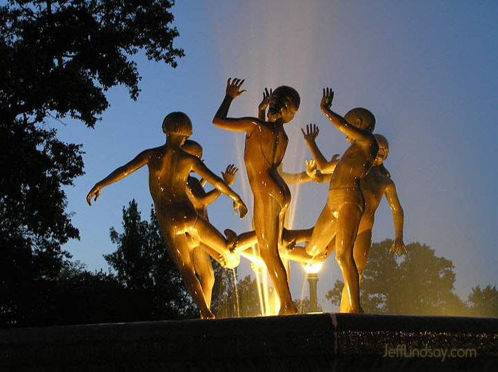 Nibley sees the ancient chorus and ancient ring dances as having temple-related roots. "Ring Dance" is also one of my favorite sculptures, a landmark of Appleton, Wisconsin where I live. The beautiful sculpture is a water fountain in Appleton's downtown City Park. It depicts children in swimsuits joyously playing as they interlock their ankles (not something from the Temple) and do a ring dance around the fountain. It's a monument to the joy of being young and the fun of human friendship and play. A couple of my photos of it are below.