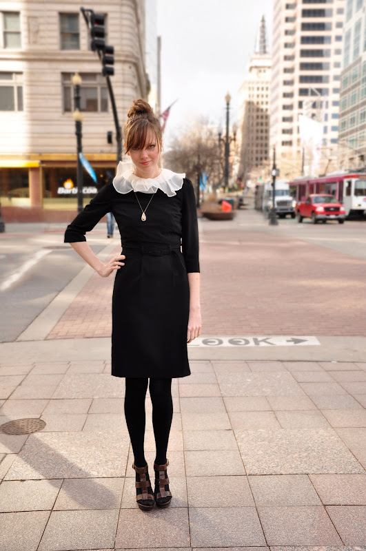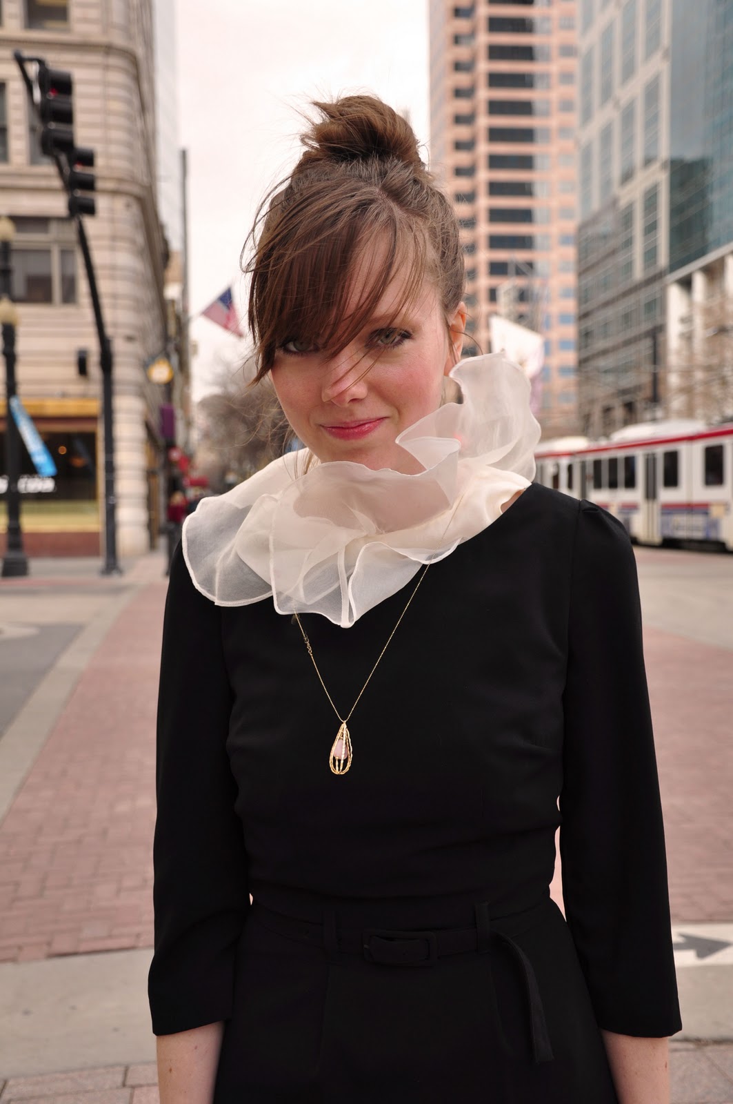 This look is inspired by Coco Chanel's legendary black dresses with white collars - especially her ruffled collars. We took a basic black H&M dress and layered a Milly blouse with a ruffled collar underneath and voila!, a classic Chanel inspired look. This sheer collar is also reminiscent of pretty sheer collars we saw at Valentino and Jason Wu for spring. The necklace is from a boutique we stumbled upon in Tokyo.