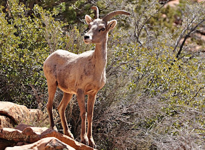 While driving out of Zion's National Park last week, a man was parked at the side of the road. He didn't even look at us as we drove by, but did make a simple gesture with his hand to point to something. All he did for me was to literally lift a finger for a second or two. That was enough to call my attention to something barely visibly from the road: a bighorn sheep