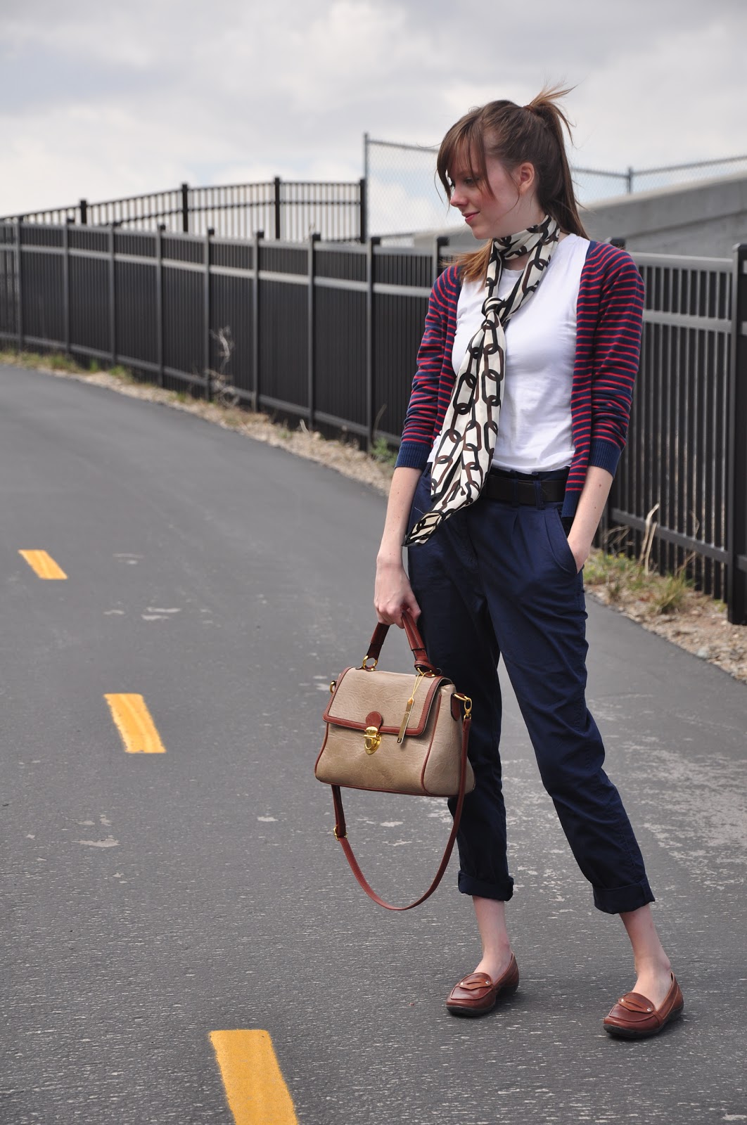 A slouchy, cuffed trouser feels so perfect right now - it's relaxed and casual, yet still a little crisp. This pair is from H&M. Cute loafers give the trousers a slight menswear vibe, and a striped cardi and simple T-shirt are super easy - perfect for running around town in comfort and style. Long silk scarves were seen on quite a few runways, including DKNY, and 3.1 Phillip Lim. It seems tying the scarf high on the neck and letting the long ends hang down the back, front, or half front and back were popular, though we just improvised and tied it until we liked it.