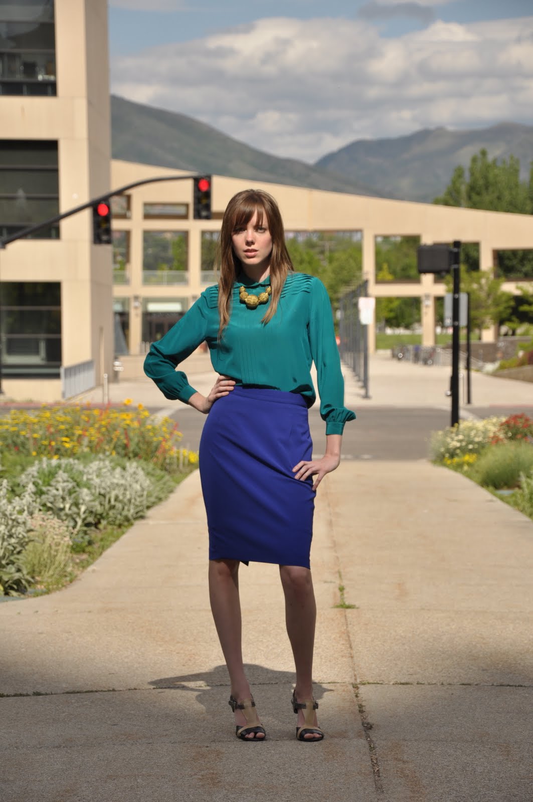 Brilliant jewel tones from the Gucci Spring 2011 runway inspired this pairing of cobalt and emerald. We used gold accessories, as they did at the Gucci show, to help set all the color off and to lightly reference the 70's Disco Era. Skirt and silk blouse are vintage, necklace is H&M, heels Nine West.