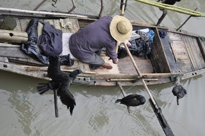 Above is a fisherman who uses cormorants to fish. The jump into the water and swallow fish, but a ring around their throat tied to the boat keeps them from swallowing the fish, so the fisherman can retrieve it from them. Maybe they get the smaller fish or chopped bits, I'm not sure. But the birds seem to cooperate well.