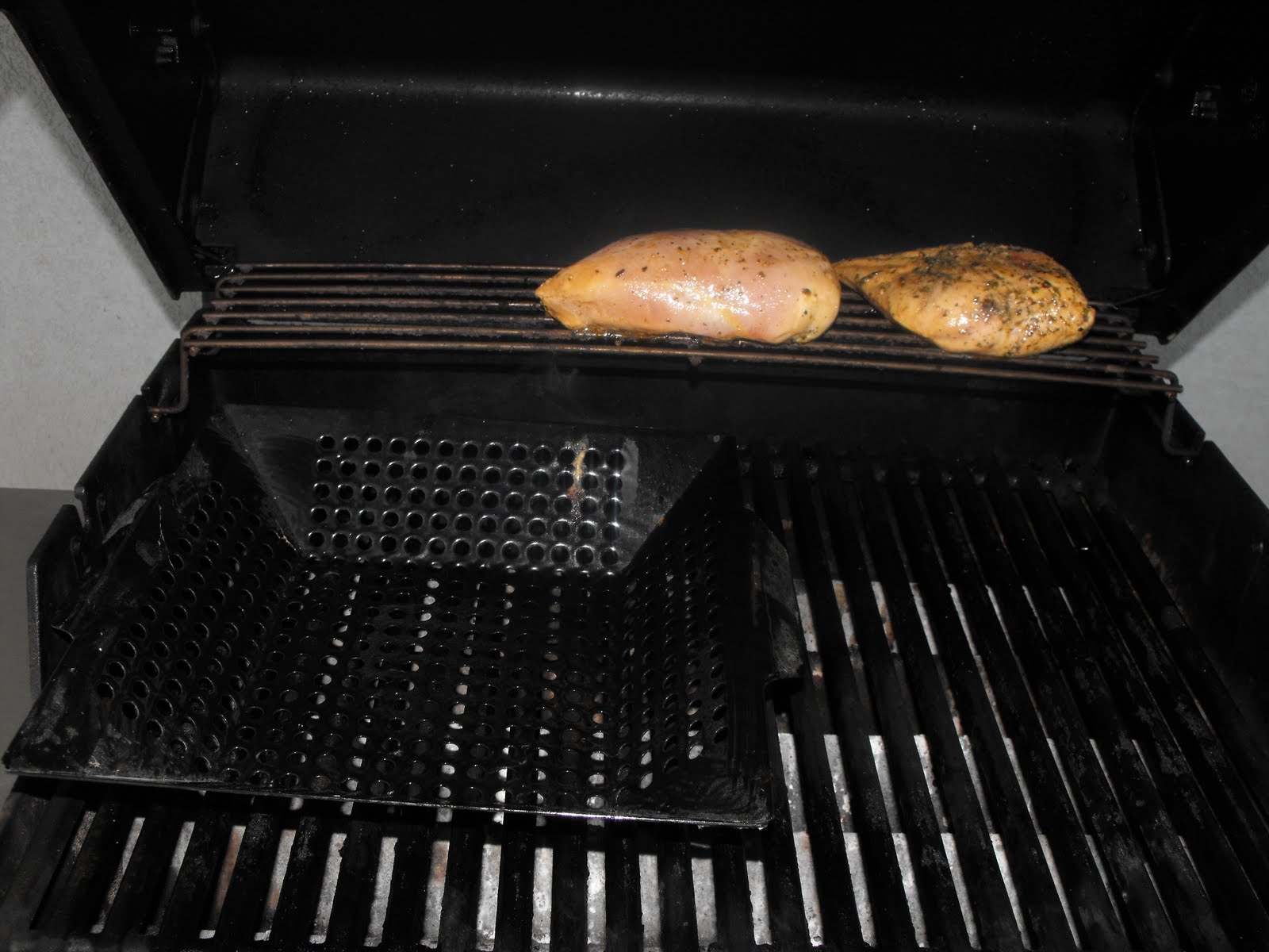 I had also marinated some chicken breasts. My husband put the chicken on to grill ahead of the vegetables. Here, he is heating up the basket made for grilling foods that are small or in pieces.