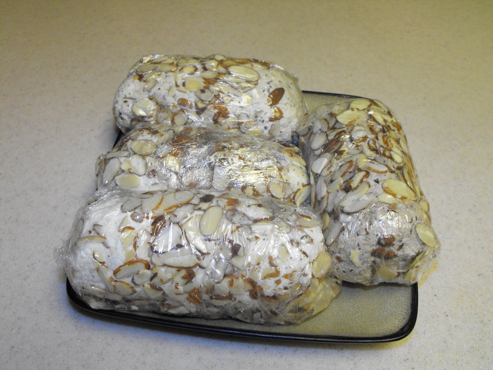 I then rolled the cheese log into the almonds and pressed the nuts into the cheese. I wrapped the log tightly.