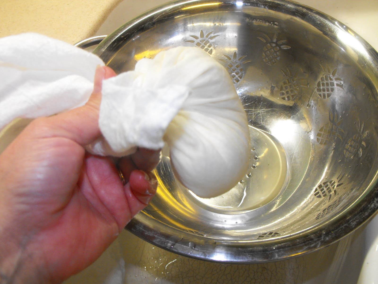Remember the "use a corner of the cloth" comment? Well, here is why. Use another corner of the cloth to help you twist the cheese in the cloth to drain the whey. It is a bit warm, and the corner makes the heat manageable to touch as you twist the ball.