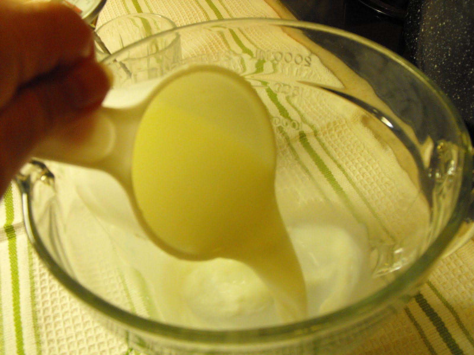 Once you reach 190 degrees, reduce your heat to keep the milk at that temperature. Now, this next part is not an exact science......which I really appreciate! Scoop out several cups of hot milk into a bowl. I started with 5 cups, but quickly increased it to much more on the second and third tries....and you will see why in a minute.