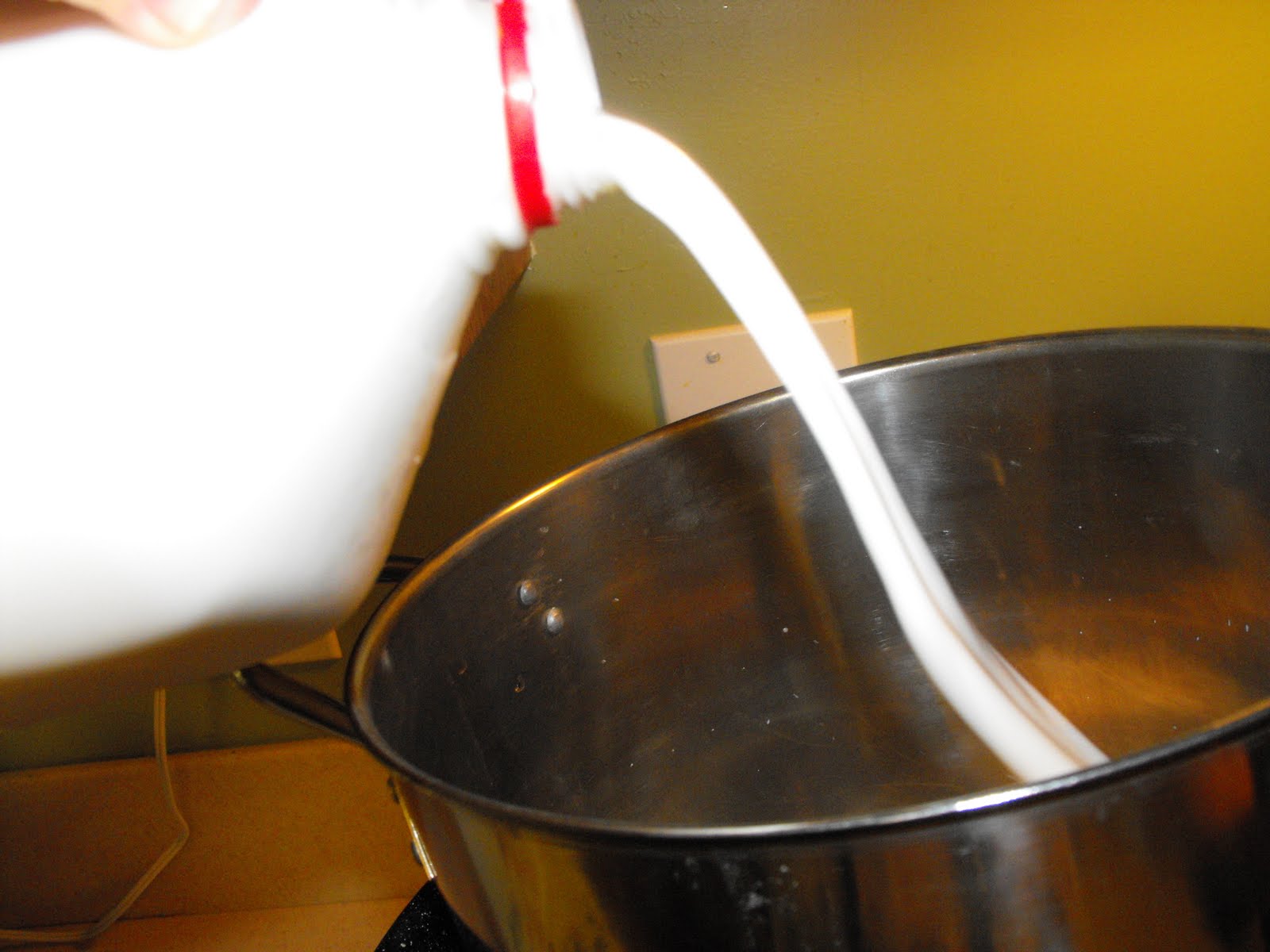 Pour your milk into your double boiler. I used 2 gallons of Whole milk. You cannot use UltraPasturized Milk...FYI. Read your labels. (For those of you thinking about your powdered milk, wait until the end of the post).