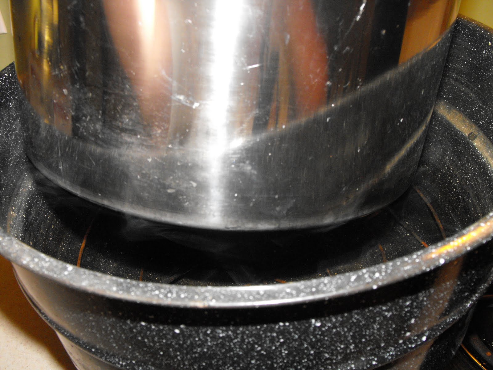 Simple things are needed for this. Following Raylene's lead, I used my Hot Water Bath Canner (with the rack at the bottom) and my largest Stock pot. This makes a large double boiler. One thing I would do differently, I would heat the water a lot initially, then put in the stock pot in preparation for the milk. This would significantly cut down on the time needed to make heat up the milk.