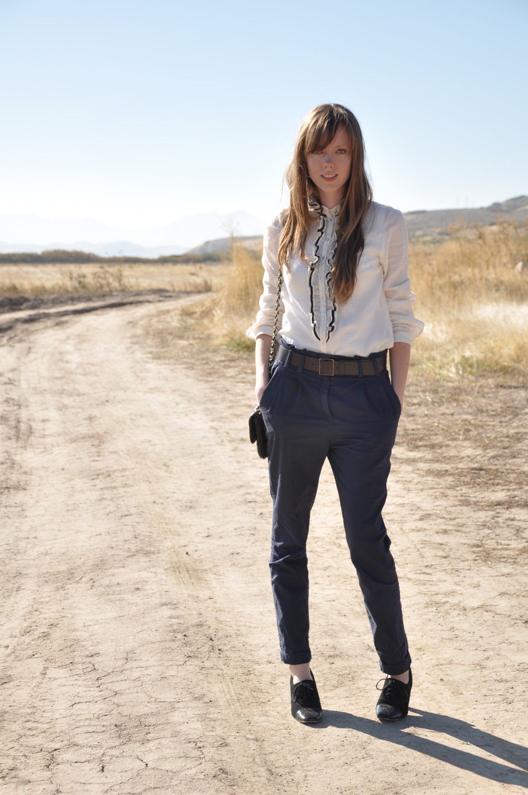 In the past we've only dressed this blouse up with chunky pearls, slacks and skirts. This time we decided to dress this front ruffled blouse down with trousers and oxfords, and quite liked the effect. Blouse Zara, trousers H&M, oxfords Target. Zara has a lovely tuxedo inspired blouse right now for those of you interested....