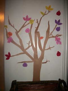 We each chose three leaves that night and wrote down something we are thankful for on them and shared them with each other. Since last Monday each morning as part of our Morning Devotional we have added a leaf or two to the tree.
