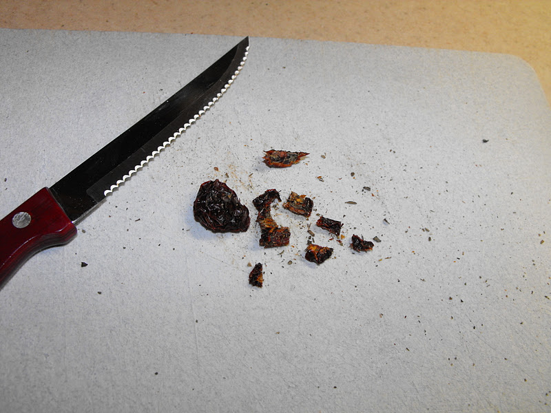 They don't look lovely, but I cut up the tomato into small pieces. In this state, the tomato is dry. (When I want to make soft Sun-dried tomatoes, I put them into a jar with Olive Oil for several days before using).