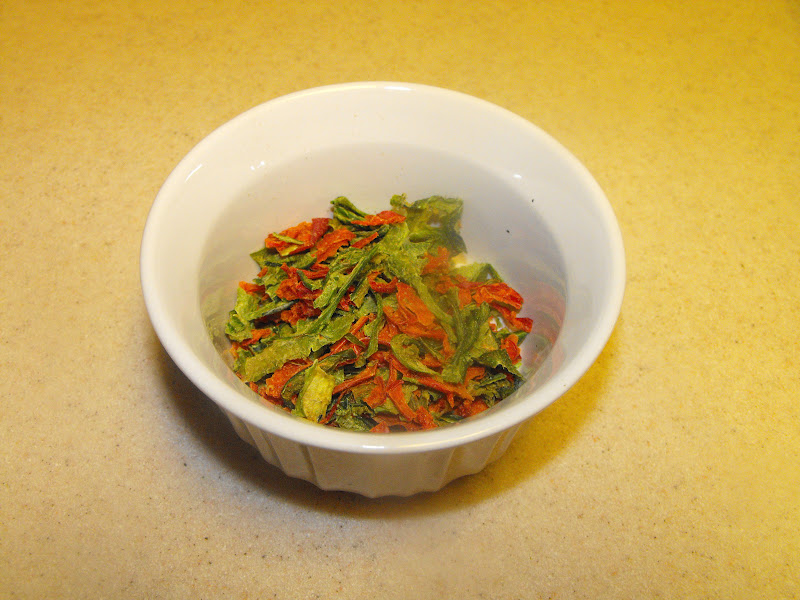 An Voila! Fresh Pepper flakes to use as I wish. Aren't they pretty? Eight bell peppers made 3 oz of Dehydrated Peppers.