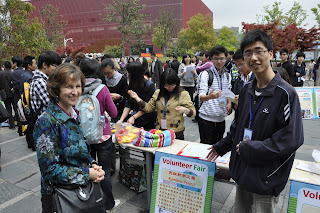 Her organization was one of many represented at a volunteer fair I attended recently at a campus of Nanjing University celebrating youth service on Global Youth Service Day, the largest service event in the world. I'm not quote sure why (because I was wearing a suit?), but the TV crew covering the story asked me to comment on the event and on why volunteerism is important. (If you saw a tall funny-looking foreigner on TV trying to speak Chinese, maybe that was me.) At this event I met one inspiring and selfless student after another with various service projects aimed at helping others in China. These are the leaders that will change the world for good.