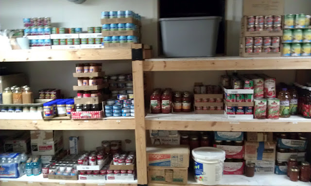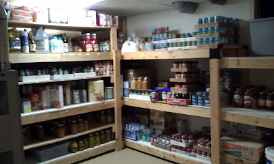 She allows for store purchased foods, and home canned foods in her storage room. I find it interesting that plastic items are near the top and glass near the bottom. There is wisdom in her choice just in case her shelves were shaken....for whatever reason.