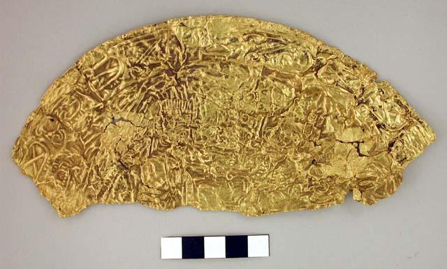 The authors not only provide photos of some of these finds, but identify the item numbers at the Peabody Museum and give a URL for the museum. The most interesting gold plate is item number 10-71-20/C10049. At the Peabody Museum Collections Online site at http://pmem.unix.fas.harvard.edu:8080/peabody/, simply enter the item number in the search box and you will be presented with the following photo of a pre-Columbian gold plate from Chichen Itza in the Yucatan Peninsula, with a small amount of additional information: