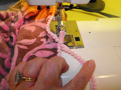 I chose to add this simple trim around all the edges. It is a small pom-pom trim. I used my zipper foot and sewed it about 5/8" from the edge of one of my Minky fabrics.