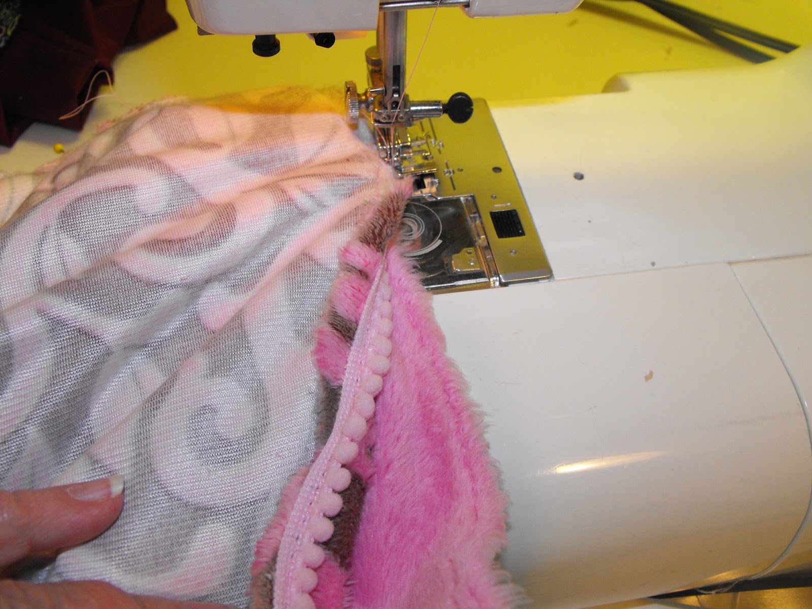 I sewed the flannel to the backside of the other piece of Minky. See the seem on the pink piece? This is from joining the flannel and the Minky together. I then sewed (with right sides of the Minky together) all 3 layers together using my zipper foot. This food edged along the trim to give me a nice clean finished edge. I sewed around all 4 sides but left an opening of about 1 foot on the 4th side to allow me to turn the blanket right-side-out. I then hand-stitched this section closed.