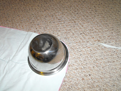 I laid out all 3 layers of the fabric and trimmed the edges to match each other. I had to sew two strips of flannel to achieve a 60" width/length for this crib-sized blanket. I then took a simple bowl and drew a curved edge on the corners. I then trimmed all 3 fabrics.