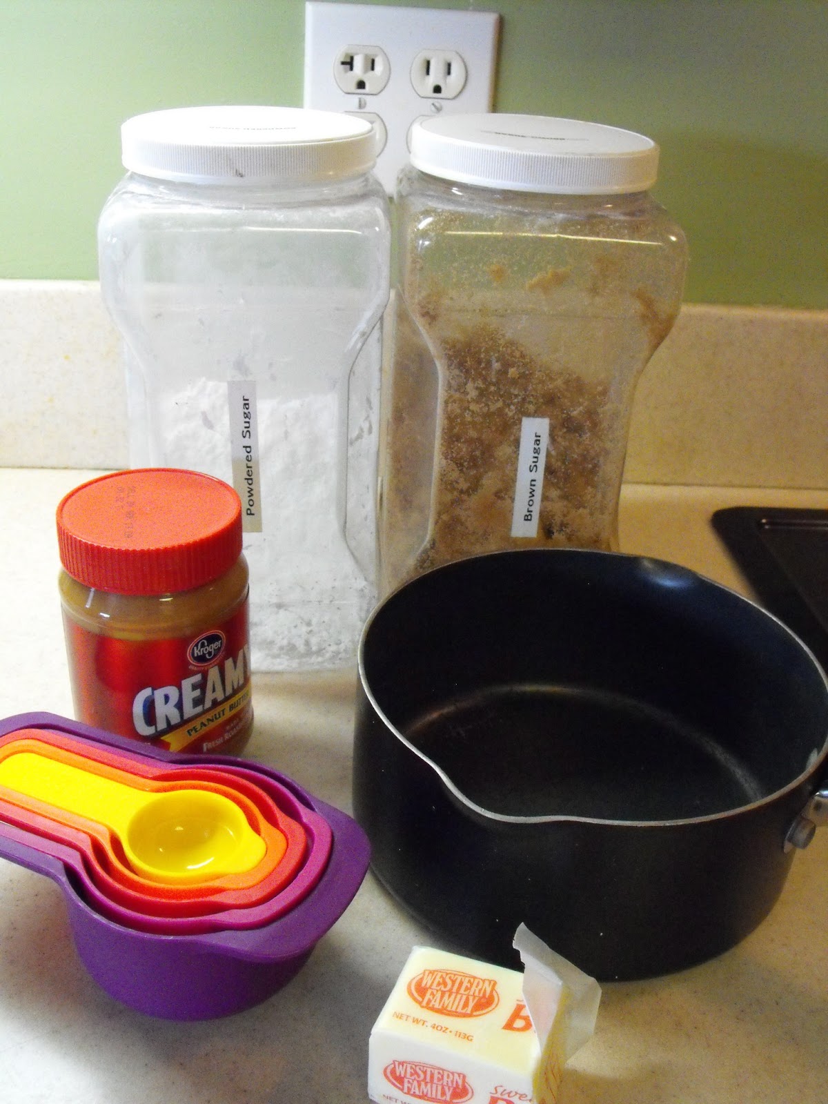 I love this recipe because it is made from Food Storage Staples that I would think anyone would have on hand. For the filling, you need unsalted butter, Brown Sugar, Creamy Peanut Butter, and Powdered Sugar.