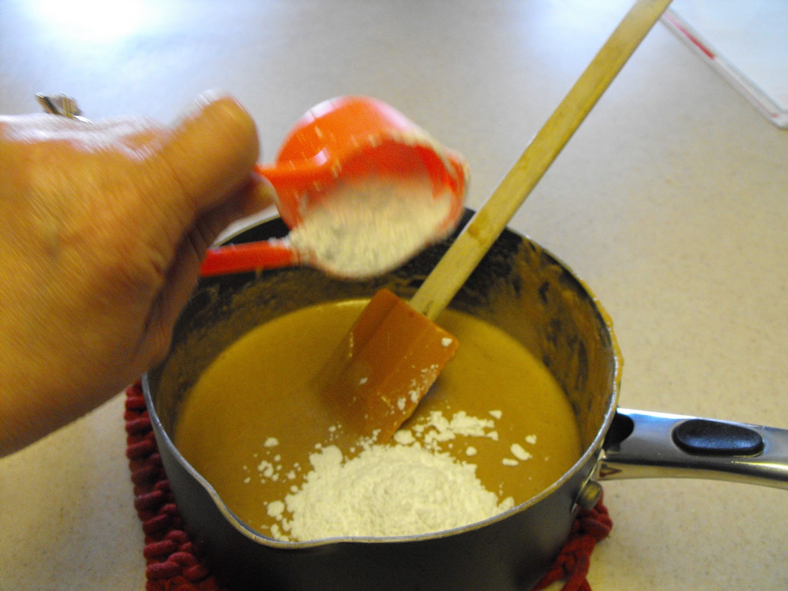 Place the pan on a a hot pad and get a 1/4 Cup measure for the Powdered Sugar.