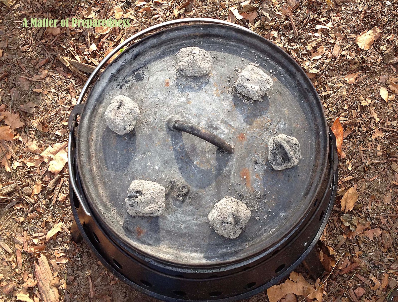 Finally, I spaced briquettes around the top. Then a short time later, we have a delicious Apple Cobbler to enjoy.