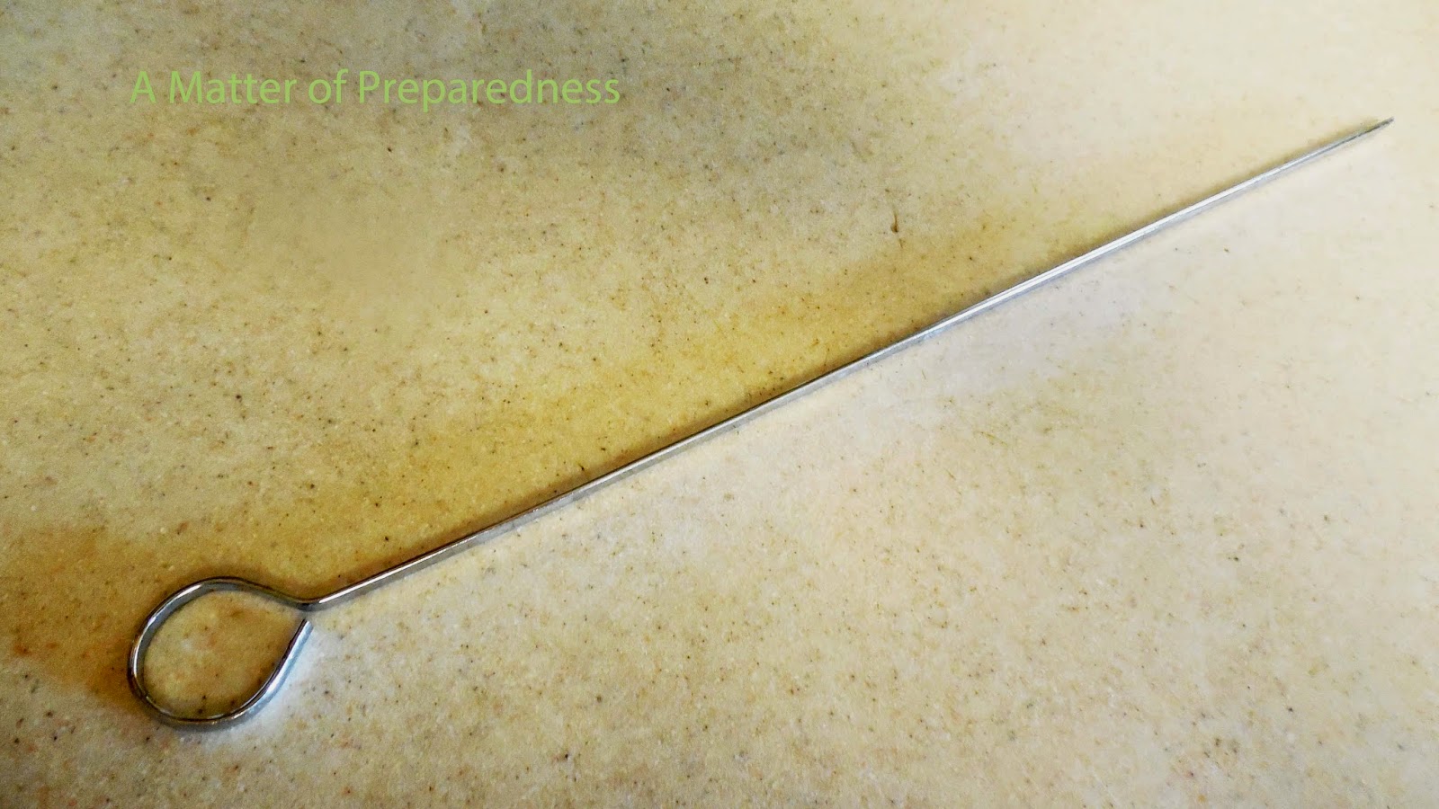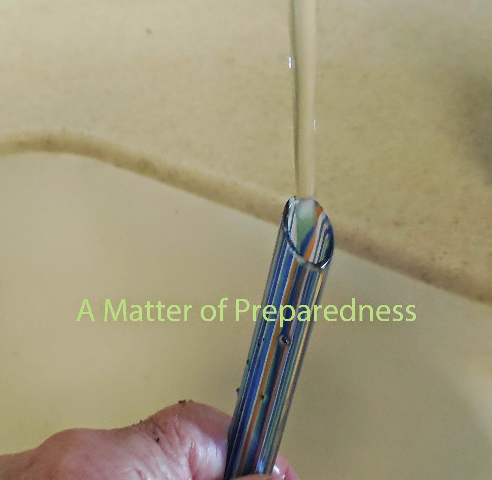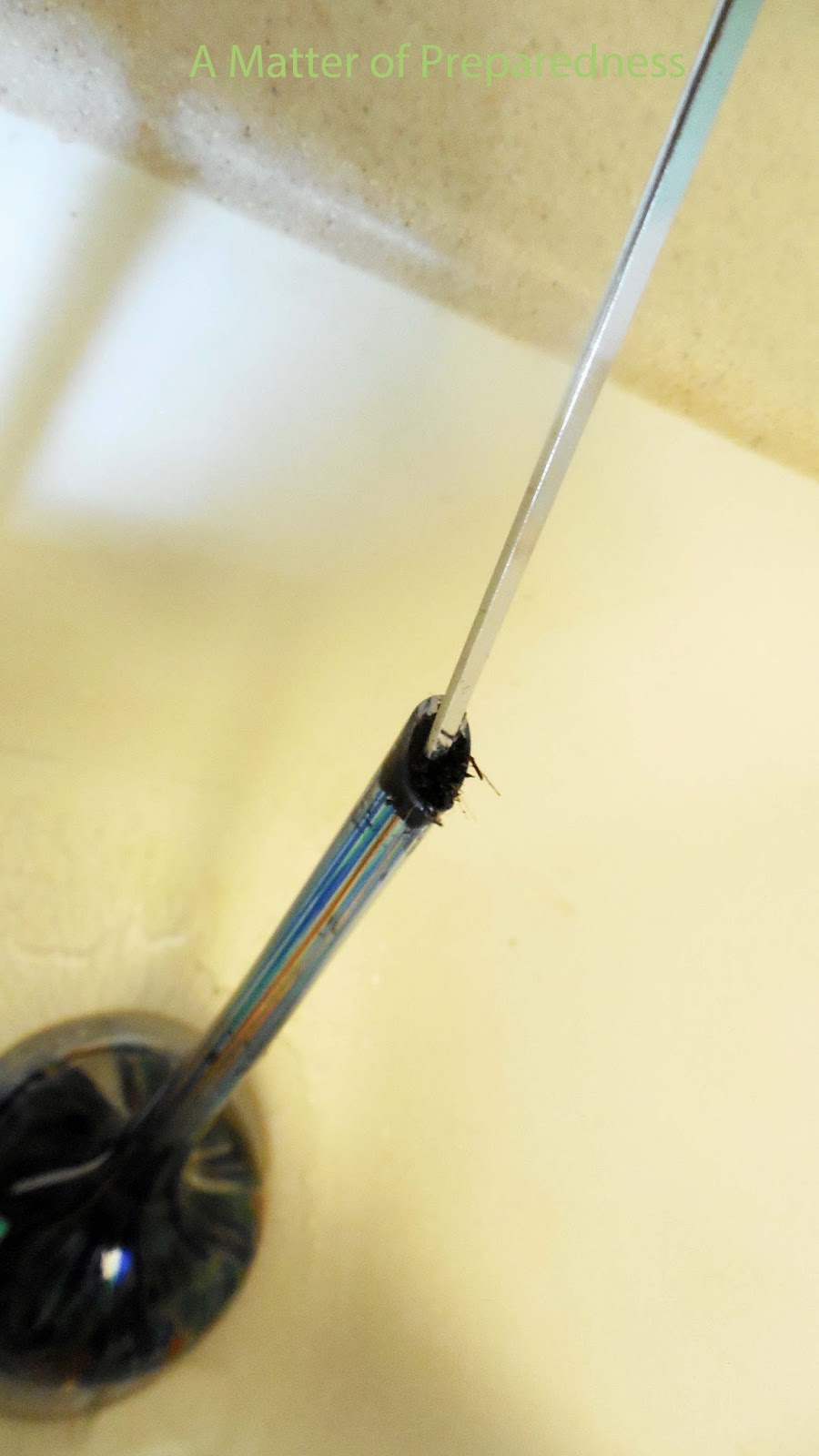 I don't know about you, but there always seems to be a little plug of dirt right at the end of the these globes. This is where the skewer comes in. I unplug it by pushing the dirt inside the globe. Now, don't worry about this dirt being inside. By the time the water has filled the globe, this dirt is either distributed in the water or floats in a suspended mixture at the top of the neck. Once the neck of the globe is place into the planter, it is the first thing to be absorbed into the soil.