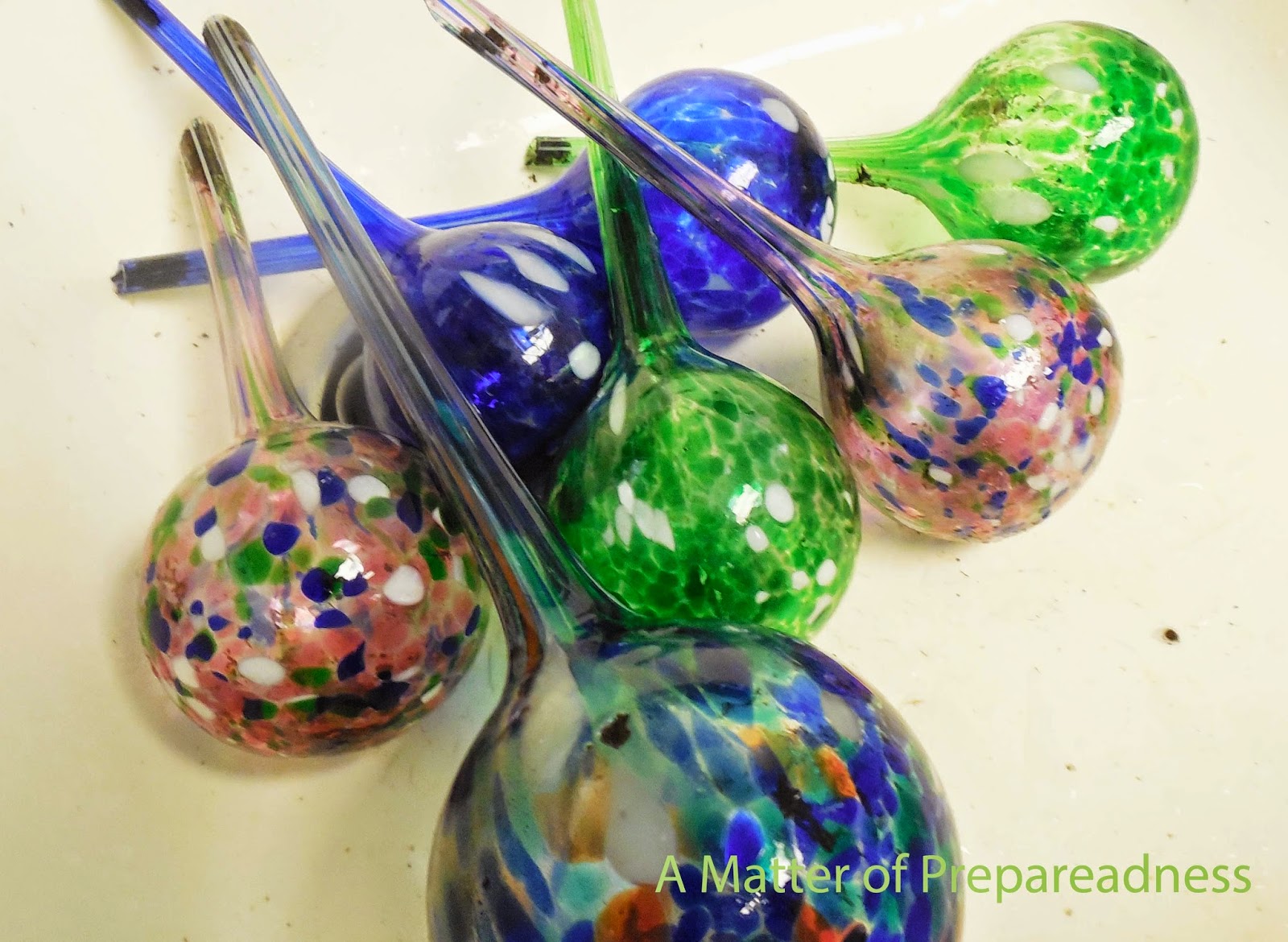 I essentially live in a Desert. This year, our city is on water rationing, so I can only water my garden and lawn on certain days and times. I also have containers in my yard as well. I usually water them with my cute green watering can, and try to extend the 'watering' with these Aqua Globes. I love the colors of them, don't you?