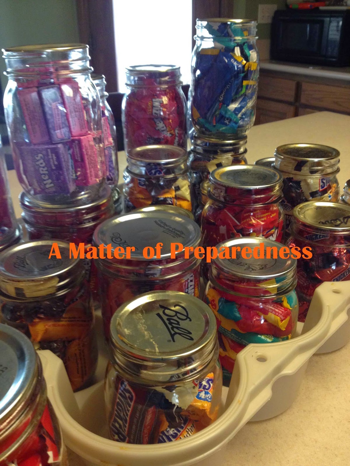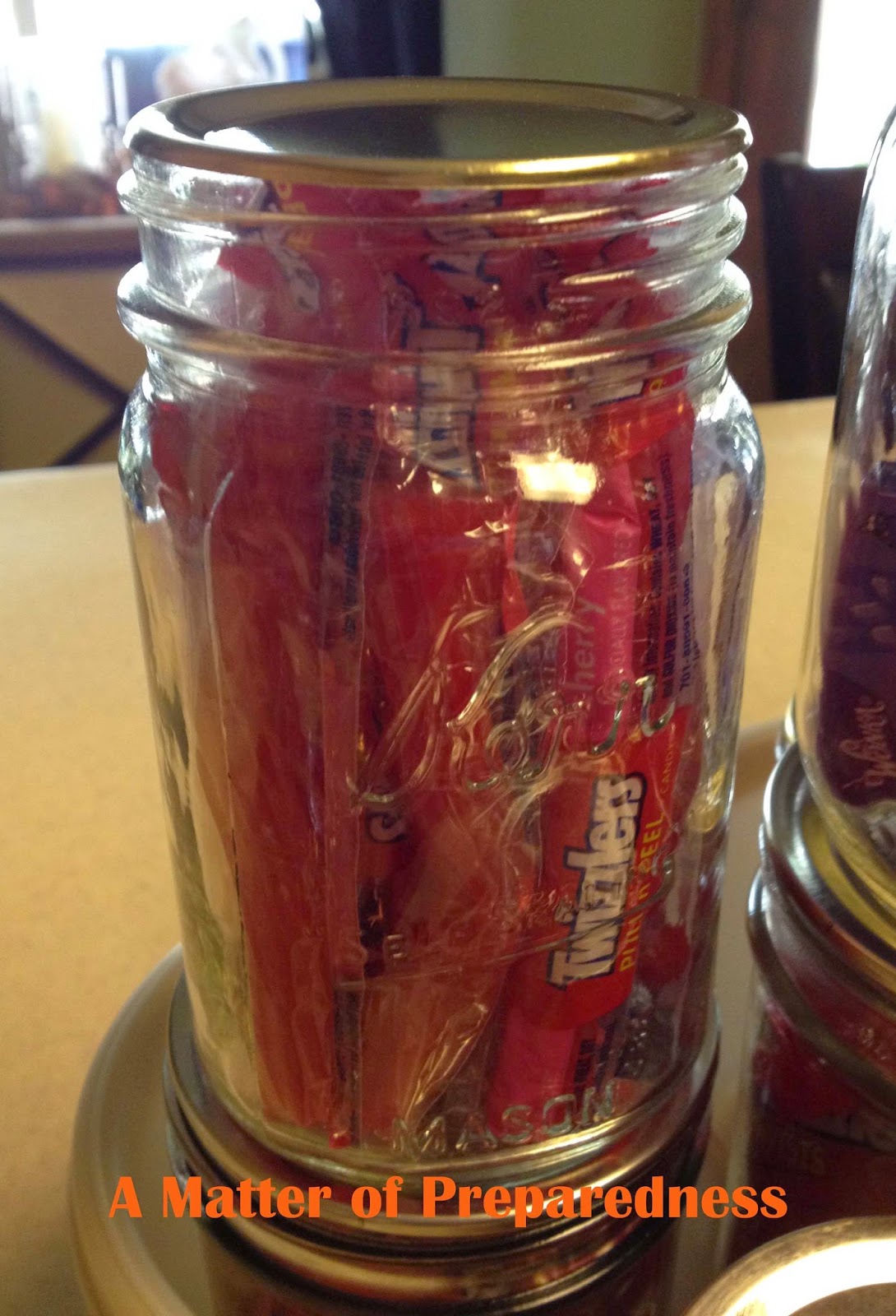I decided to can different candies in pint jars....so that when we did get into them....there wouldn't be mounds of candy to consume quickly all at once. I did this because vacuum sealing helps keep chocolate from getting white, and helps keep things like taffy and licorice stay soft.