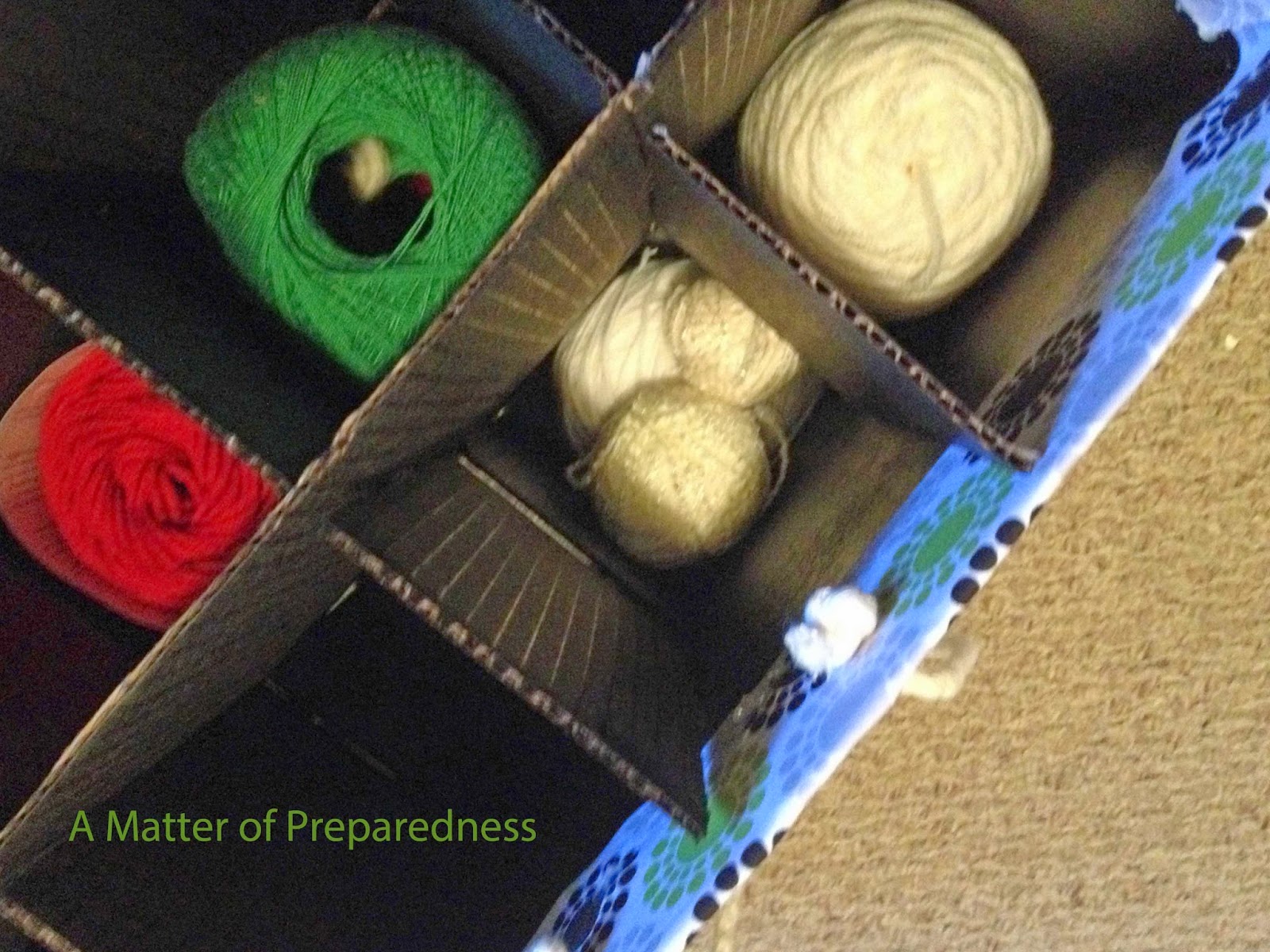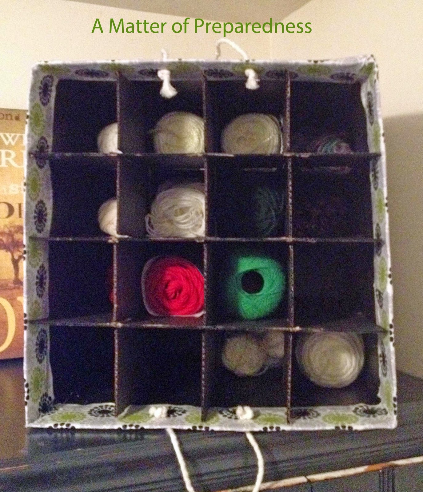 I can even fit balls of yarn down into a compartment. Notice that I wrapped the upper edge of the box with about 4 inches and glued it to the box before inserting the dividers.