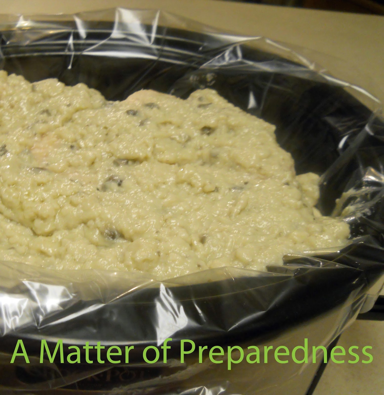 I prefer to use Crockpot liners to avoid baked on messes. Here I am using Chicken Fingers that are frozen. I drop them right in.