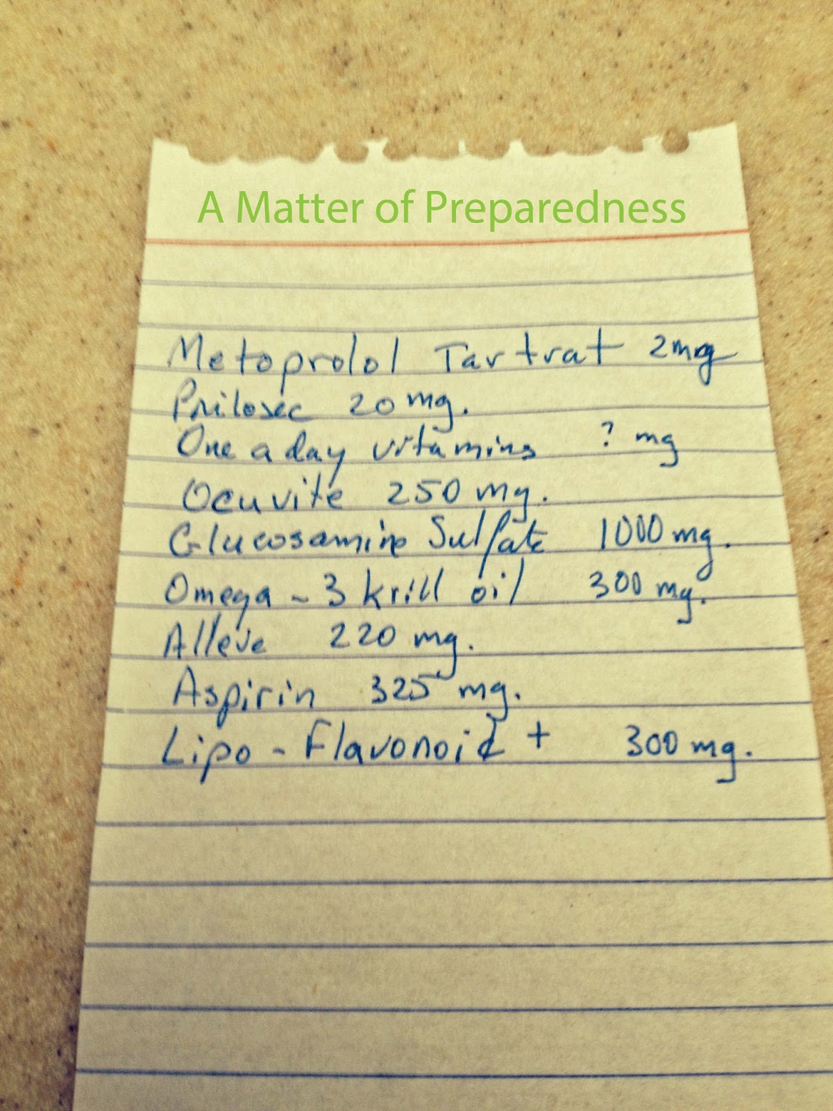 Also, there are many apps like "Carezone" that allow you to scan your medications and it keeps a list for you. Since so many of us are so attached to our Smart phones, this may be a very viable option as long as you have power for your phone.