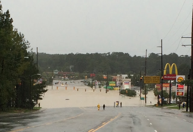 This is a road that I used to drive on to go in to town when I lived in South Carolina. If you look closely, you will see that the workers are standing near the edge of a big flood. Just know that there are several lanes of road under the water. This is a major thoroughfare in Columbia SC. The flooding took place in early October. I wrote about this topic somewhat in this post.