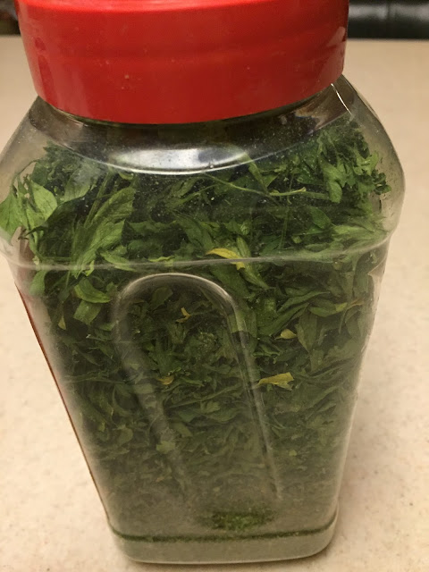 I put a piece of paper-towel under the container to catch 'stray pieces' of Parsley. Next, I took the clean handle of one of my rubber spatula and started compressing the parsley. This helps it break into the small pieces that you traditionally see when you purchase dehydrated parsley.