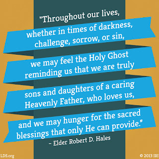 “Throughout our lives, whether in times of darkness, challenge, sorrow, or sin, we may feel the Holy Ghost reminding us that we are truly sons and daughters of a caring Heavenly Father, who loves us, and we may hunger for the sacred blessings that only He can provide.”—Elder Robert D. Hales, “Coming to Ourselves: The Sacrament, the Temple, and Sacrifice in Service” Accessed June 9, 2016 from the LDS Media Library.