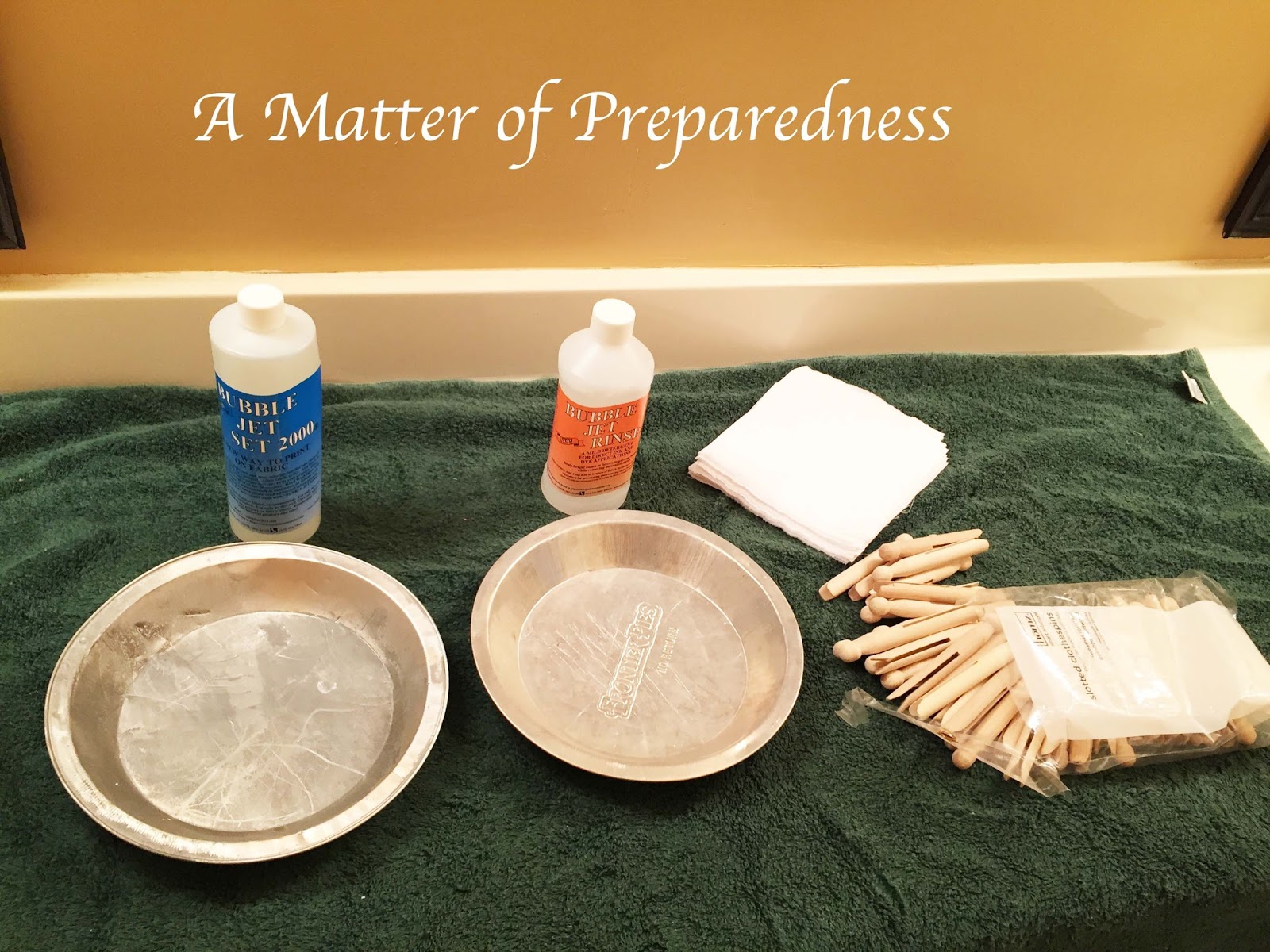 Before you begin, you will need to purchase 100% white cotton fabric, which needs to be pre-washed before you begin this process. I took over a bathroom in my house to do this. I set out a towel to protect my counter, got 2 containers that were not dear to me, and set out the supplies:
