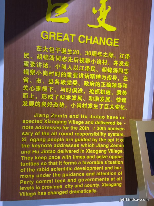 When my wife and I with two other Western friends finally arrived at the primary building about the Xiaogang miracle, I was amazed at how large it was. And what a thrill to finally be there! But where were all the crowds? The place was obviously built with the expectation of big tour groups, but it seemed rather vacant on the Saturday when we showed up. Never mind, I was so excited to finally be here.