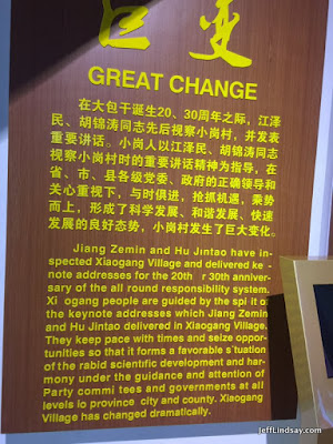 "The daring feet that we did at the risk of our lives in those days has become a thunder arousing China's reform, and a symbol of China's reform."Whatever you think about the politics of China and the revolution that gave us the nation of China, I think all of us Westerners can embrace and learn from this second revolution of China that has lifted so many of its people and brought so much opportunity and hope. At this time of thanksgiving, the courage of those who brought about the Xiaogang miracle is one of the things that I am grateful for. And how grateful I am that I could visit that site and meet some of the locals of Xiaogang. Sadly, I was the first foreigner they had seen there for months, one worker told me. Wish more of you would come by and experience the spirit of this place.