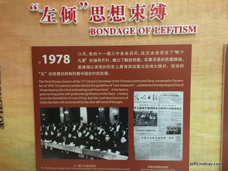 The memorial had some frank information though it was very tactfully presented and balanced with reminders of the positive impact of many fine speeches given by officials over the years that greatly cheered and motivated the workers.  But repeatedly we can see hints about the "bondage of leftism" (utra-radical leftism, we are told, not the good moderate kind) and the excesses of the Cultural Revolution. The scene below from the museum is of a landowner being harassed for having taken the "capitalist road." Those scenes could be very tragic.